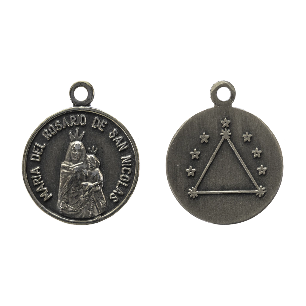 Dije entre 15 y 20mm de diámetro, confeccionado en alpaca y baño de plata, con imágenes religiosas en relieve.