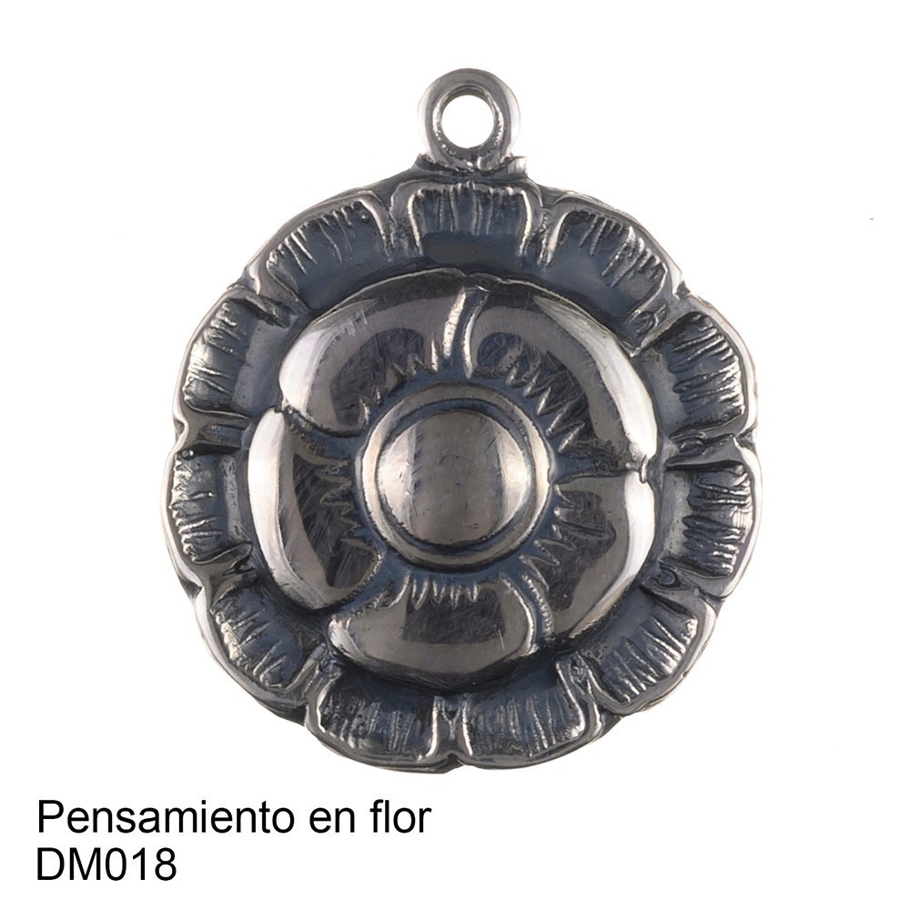 Dije entre 20 y 25mm de diámetro, confeccionado en alpaca y baño de plata, con imágenes en relieve.