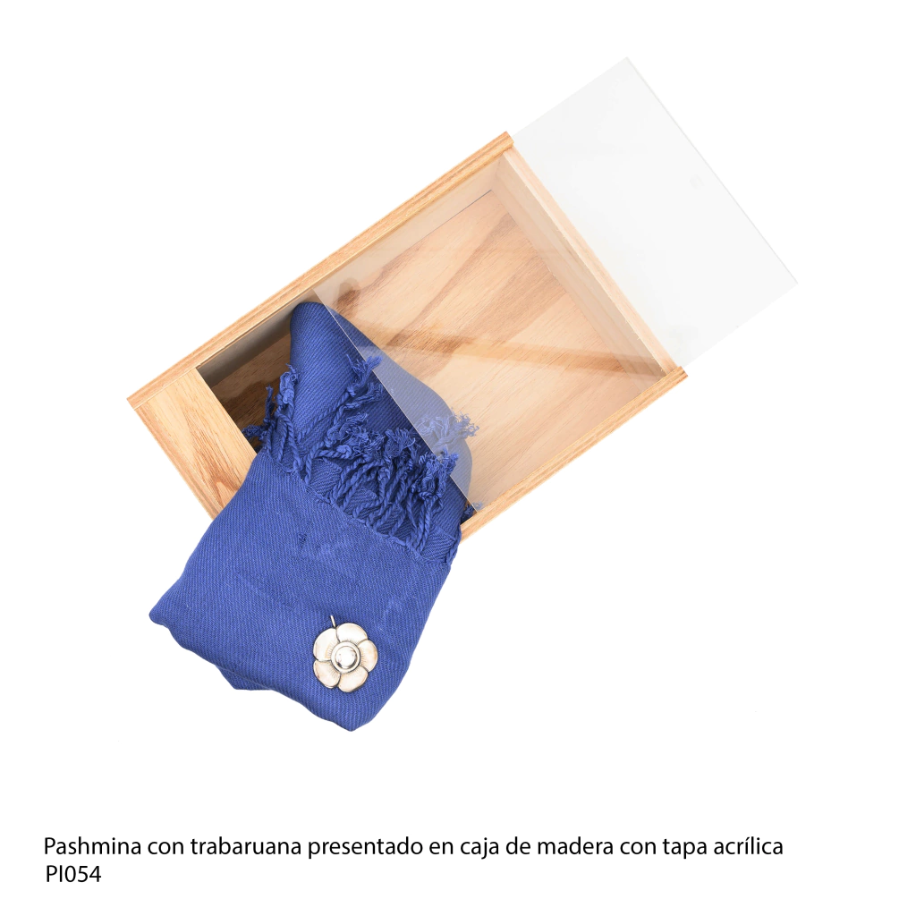 Pashmina rayada / lisa, con trabarruana super confeccionado en alpaca. Presentado en caja de madera con tapa acrílica (opcional personalizar con grabado a láser en tapa o en madera, consultar).